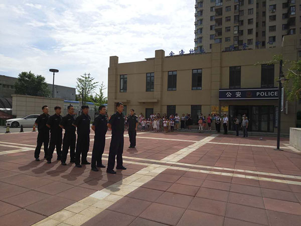 活動中,小朋友們首先觀看了金海物業特勤隊表演的保安日常訓練科目——隊列和擒敵拳,隨后進行了 “小小客服”、“小小管家”及“小小園丁”物業服務崗位的體驗,并參觀了濱江3號優美的園區,和爸爸媽媽在園區合影留念。