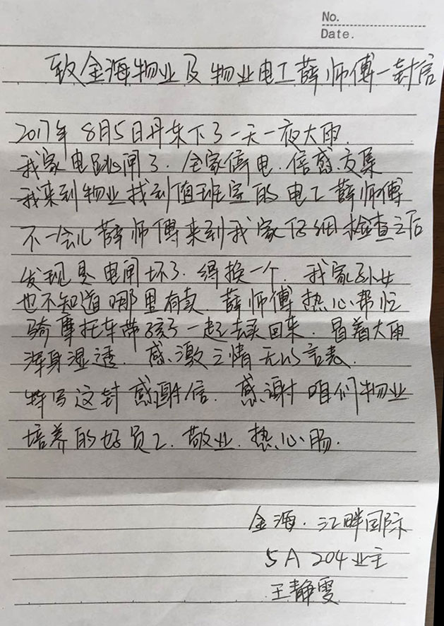 致金海物業(yè)及物業(yè)電工薛師傅一封信