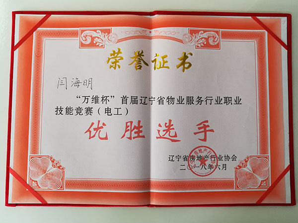 6月2日,由遼寧省房地產行業協會主辦“萬維物業杯”首屆遼寧省物業服務行業職業技能競賽在沈陽市遼寧省水利職業學院開賽,共有來自14個城市的近百名選手參賽。物業總公司選派宋修繹、閆海明參加物業管理員組、電工組比賽,兩人取得優異成績,分別獲得遼寧省房地產行業協會頒發的“優勝選手”、“優秀選手”榮譽稱號。金海物業代表隊是丹東市所有參賽代表隊中唯一獲獎隊伍。
