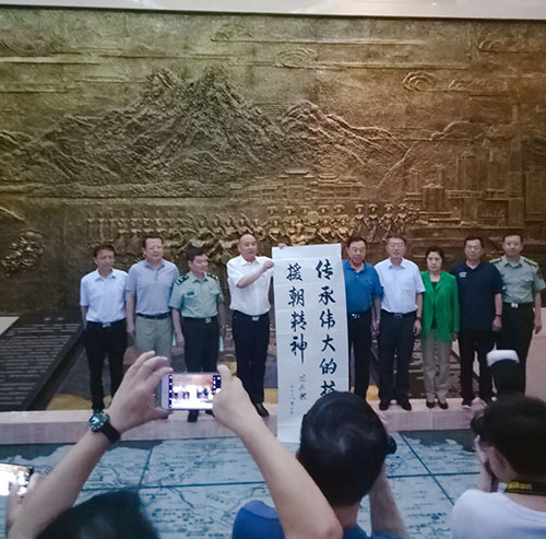 7月14日上午,原中央政治局委員、中央軍委副主席范長龍一行,在丹東市領導及相關人員陪同下,冒雨視察了全國愛國主義教育基地——丹東抗美援朝紀念館,并留下了“傳承偉大的抗美援朝精神”的親筆題字。