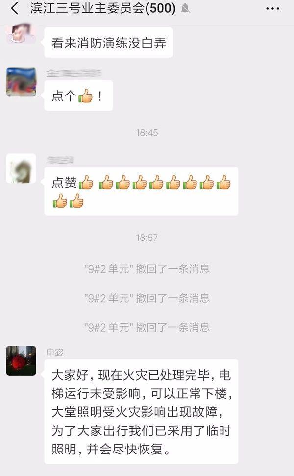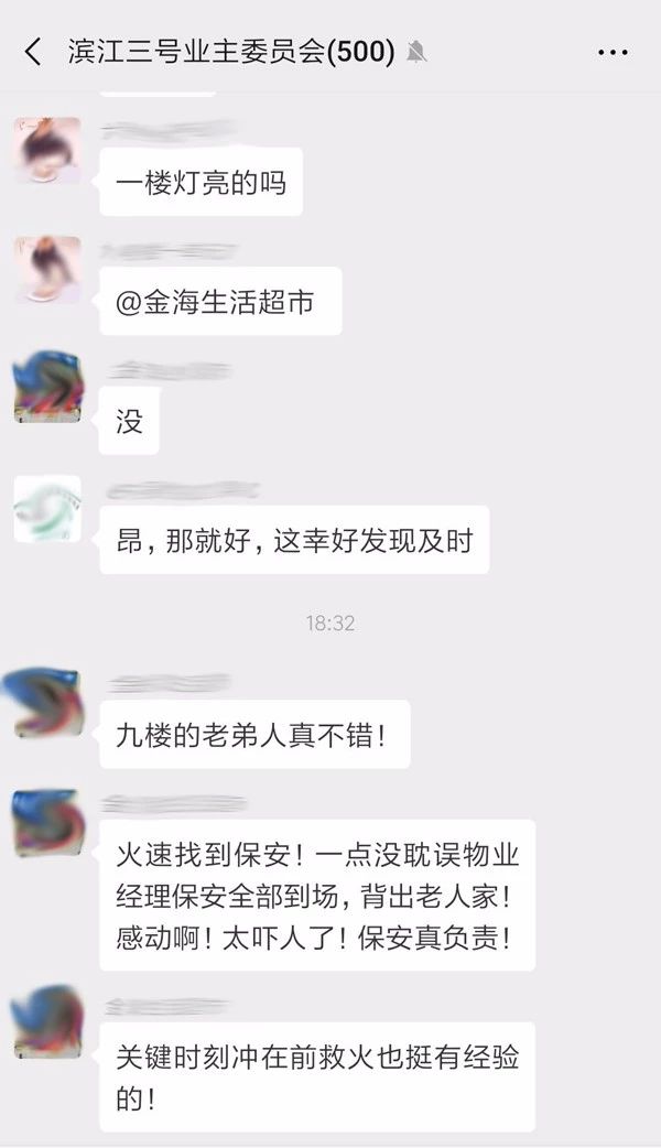 濱江3號管理部全體維修人員在火災得到控制后立即全面檢查所有電梯、電路及設施,保證業主正常使用,物業管家給6號樓1單元業主撥打電話做好溫馨提示,并在業主群通報情況,避免業主出現恐慌情緒,讓業主安心。同時,第一時間請華潤天然氣工作人員到現場排查,消除安全隱患。保安員處理好現場燒毀物品,疏導人員進出,保證業主安全。