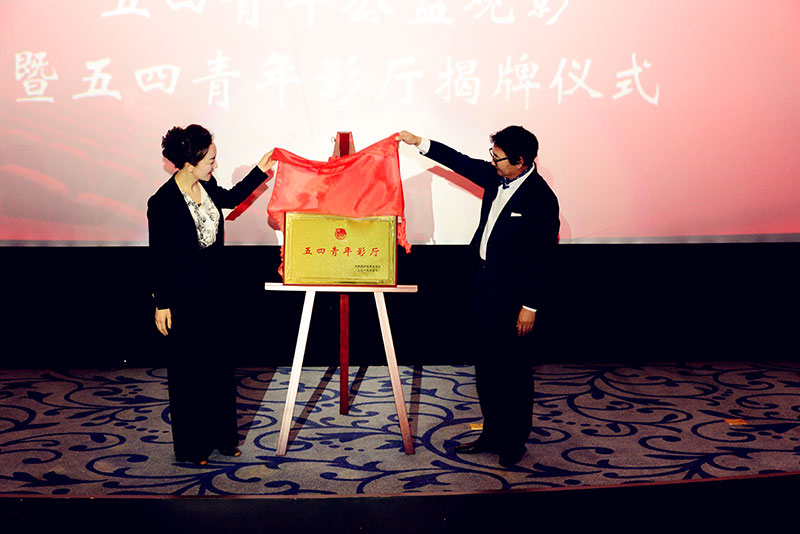 團市委副書記張翔、遼寧金海集團董事長高翔為丹東市“五四青年影廳”揭牌。