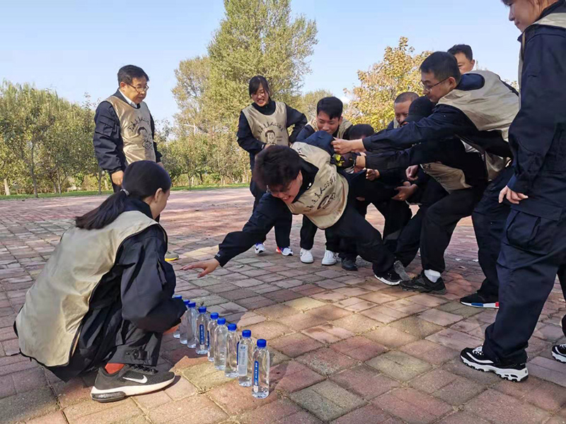 拓展活動中,共開展了“支援前線”、“合力取水”、“蛟龍出海”、“生命動力繩圈”4個環節。其中,在“支援前線”環節,當教官喊出要收集的物資,各隊隊員爭先恐后地在有限的時間內收集好物資送到“前線”;在“合力取水”環節,大家爭分奪秒不借助任何物體完成取水任務,靠的是團隊配合的默契度;在“蛟龍出海”環節,全隊伙伴用綁腿繩將腳連在一起,橫向一排,用團隊配合的力量,用盡量少的時間到達終點……
