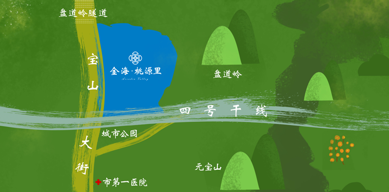 金海·桃源里,連接著元寶山,青山秀巒,鳥語花香。山體綠化、臺式綠化將是重要景觀亮點。未來的景觀帶,潺潺的流水,風(fēng)景宜人。