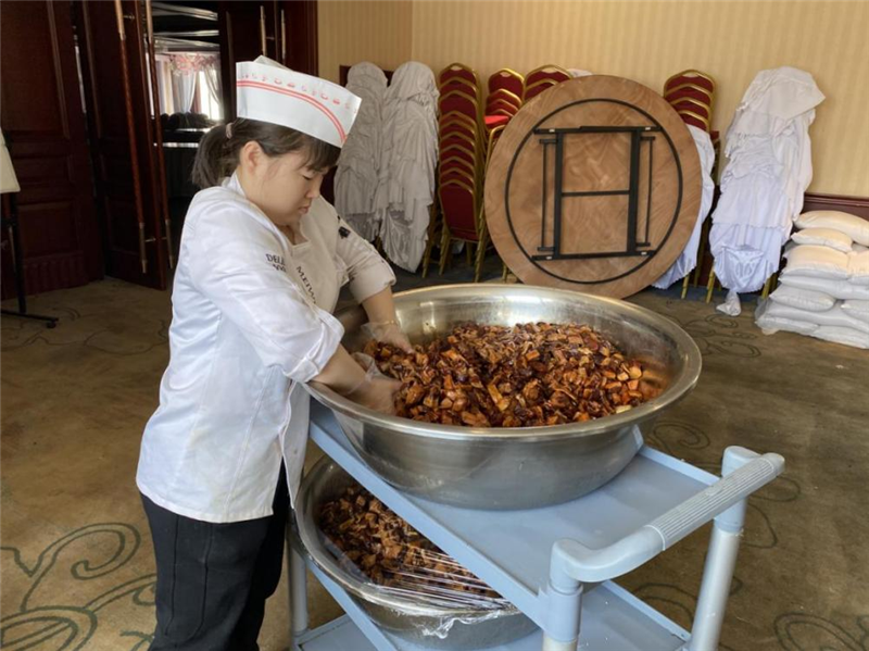 綠茵茵的粽葉,糯嘰嘰的大黃米,腌制入味的五花肉……端午將至,金海大廈出品的手工傳統(tǒng)粽子樣式繁多:有白米粽、紅棗粽、大黃米粽、桃仁花生粽、豬肉粽……金海大廈廚師長說:“從原材料、配料、成品制作到裝箱,都是我親自盯著的,大廈出品,必是精品。”