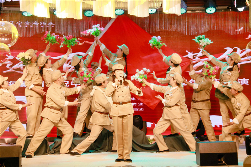 表演嘉賓多才多藝,用不同的藝術形式展現自己的風采,合唱、舞蹈等節目在舞臺上大放光彩。金海物業秩序維護部的成員,他們都是退伍軍人,他們不善言語,在這個特殊的日子用歌聲表達對中國共產黨的熱愛祝福。