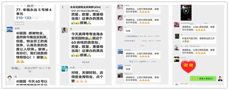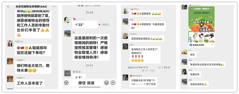 “疫情當下,物業主動為業主采購蔬菜包,不僅價格便宜,還特別的新鮮,真的非常感謝!”“家里斷糧了,送的太及時了!”“家里只有老兩口,行動不便,感謝金海想著我們”“感謝物業辛苦送菜”……暖心之舉也讓業主群里頓時熱鬧了起來,點贊的聲音比比皆是。有的業主心疼工作人員,也紛紛送來自家的物資及食物,新鮮的蔬菜,愛心的“投喂”,在嚴峻的疫情下,依舊流動著暖暖的溫情。